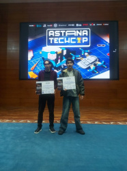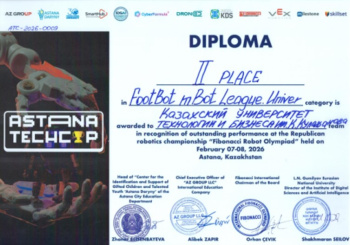 The "KazUTB" team was composed of 1st, 2nd, and 3rd-year students of the "Information Systems" educational program: Musakhmet Daniyal (group IS-231 co), Zhalmagambetov Damir (group IS-242/3 co), Kozhakhmet Adilet (group IS-252/2 co), Kairat Anuarbek (group IS-241/3), Abdumalik Sherkhan (group IS-241/3). The team participated in the "Fibonacci International Robot Olympiad" category. Our students worthily represented the university and achieved victory, winning 1st and 2nd places in the "FootBot Lego League.Univer" and "FootBot mBot League.Univer" categories.